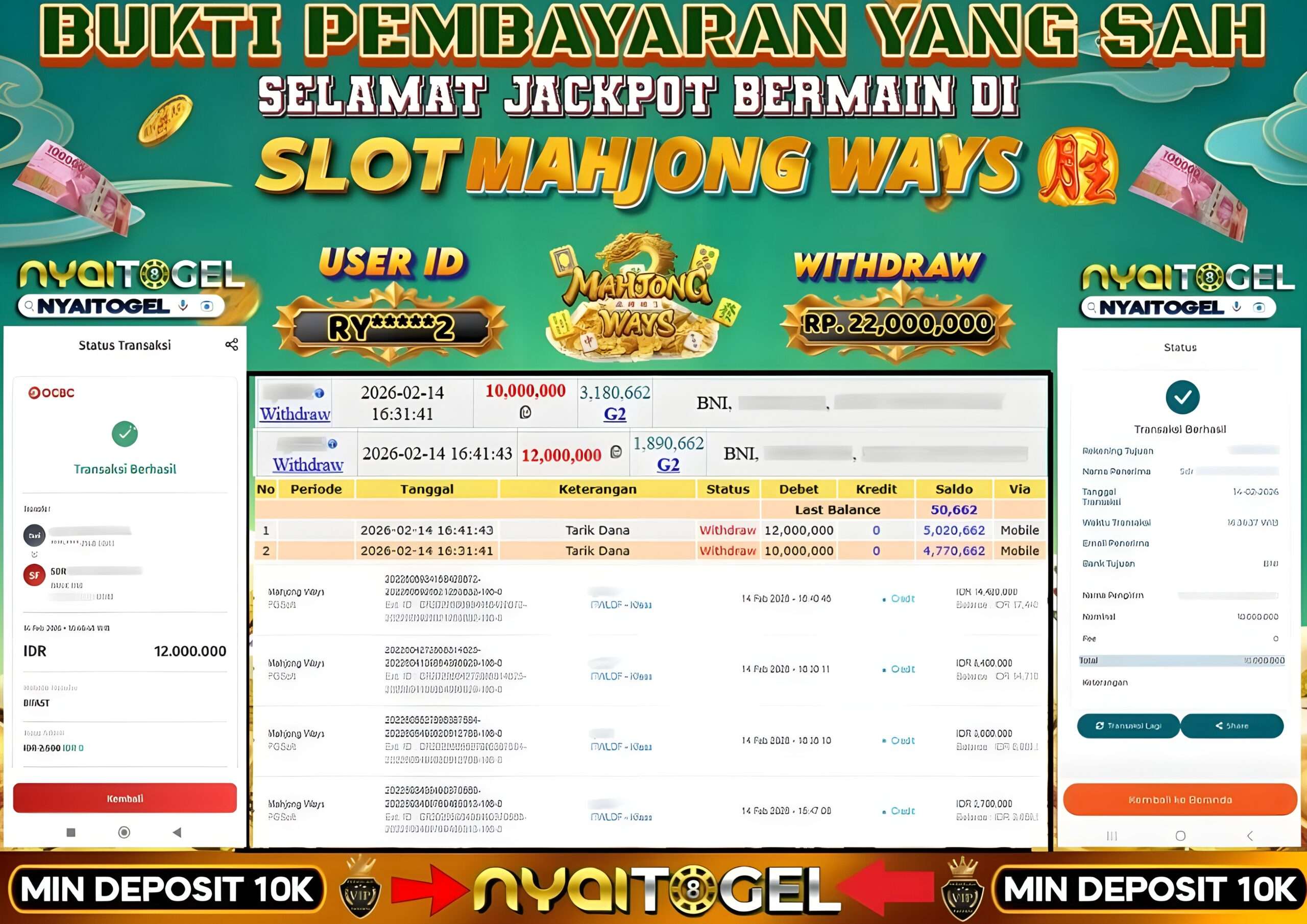 Berikut ini adalah Bukti Jackpot Slot Nyaitogel 14 Februari 2026 yang sudah diproseskan langsung ke rekening member kami :