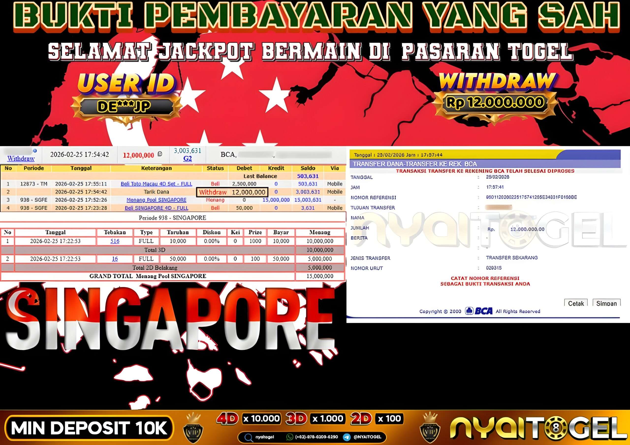 Selamat Kepada Member Setia NYAITOGEL dengan USER ID : DE****JP Jackpot di Togel SINGAPORE sebesar RP. 12.000.000,– LUNAS langsung mendarat ke rekening tanpa bertele – tele. Terimakasih telah mempercayakan NYAITOGEL sebagai Situs Bandar Terpercaya dan Terjamin Aman! Tunggu apalagi? Daftar sekarang juga bersama NYAITOGEL dan dapatkan berbagai promo menarik setiap harinya.